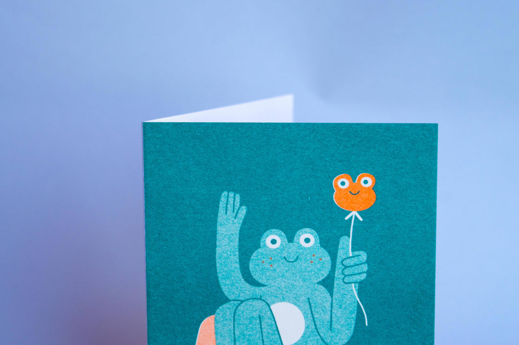 Hello Frog - Risograph printed 13.4 x 9.8cm card with A6 envelope, using 250gsm context paper, made from 100% recycled post-consumer waste. Riso is an eco-friendly print process with a unique aesthetic. Blank inside. Each card is packaged with a recycled kraft envelope and in a plant based compostable and biodegradable clear bag. The perfect card for birthdays, valentines day, anniversary or even to celebrate a new home!