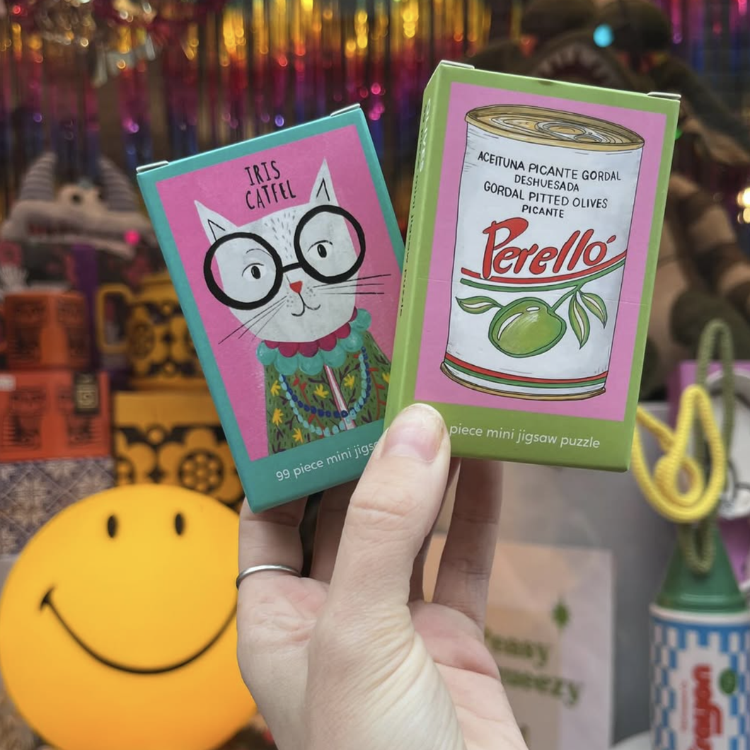 99 Piece Mini Jigsaw Puzzle featuring a fun illustration of can of olives by acclaimed illustrator Natalia Yañez-Stiel. The perfect gift for foodies.