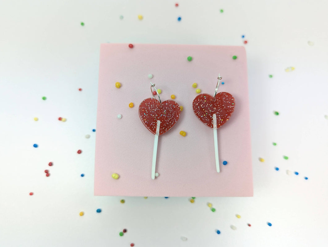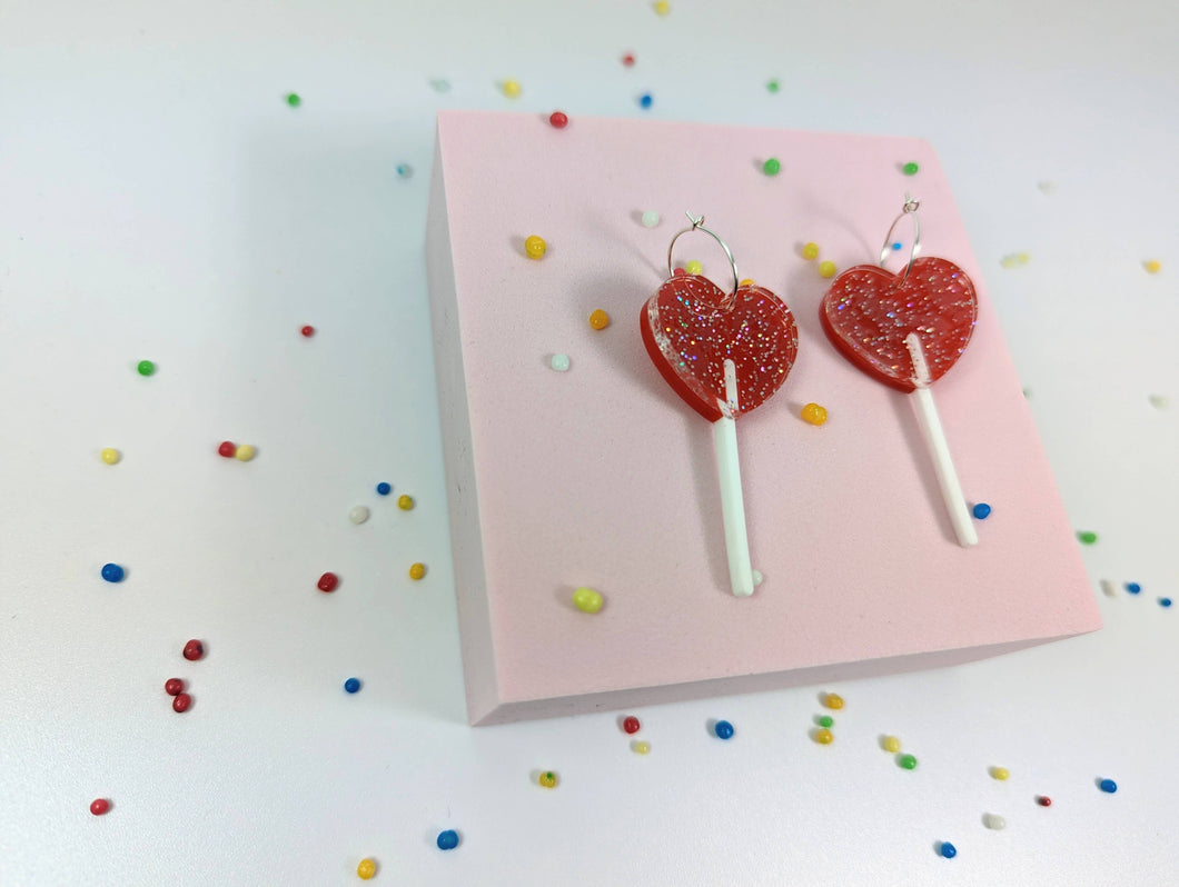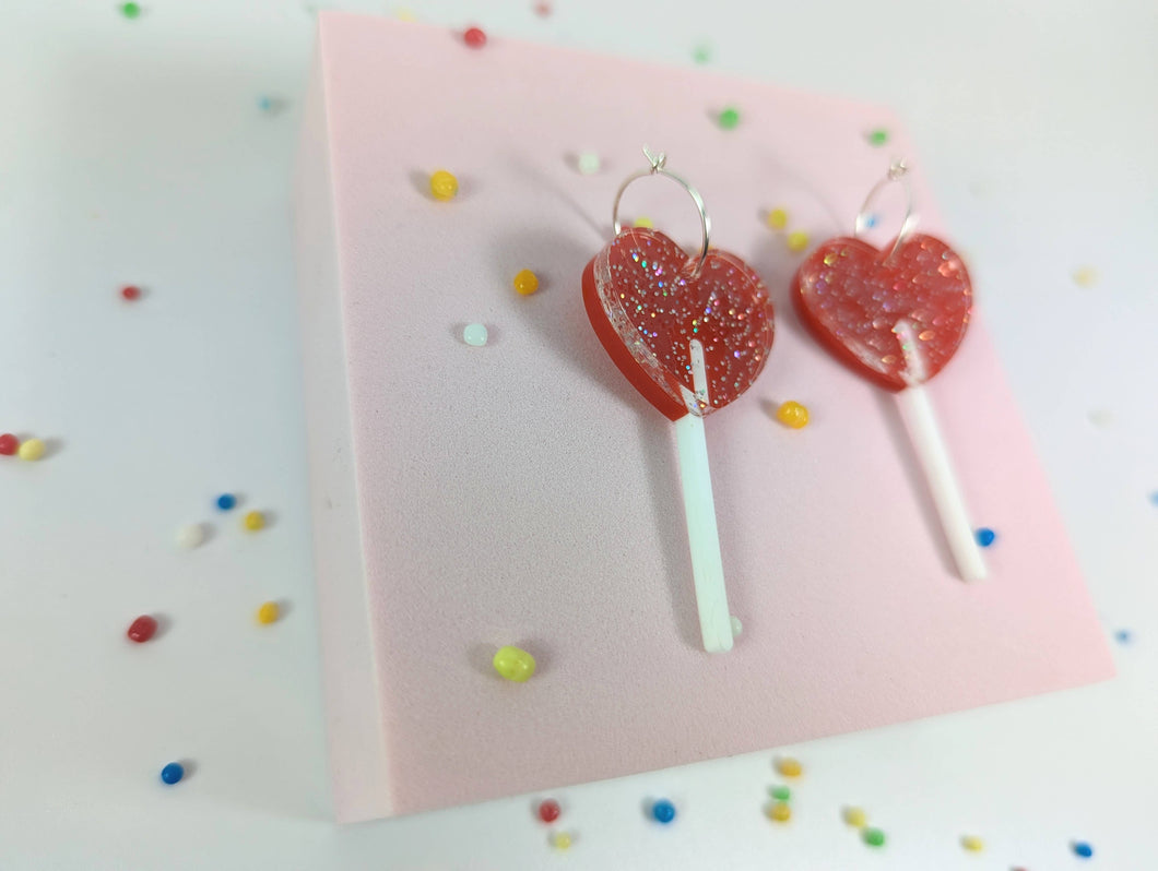 Heart lollipop earrings on acrylic and Sterling silver hoops