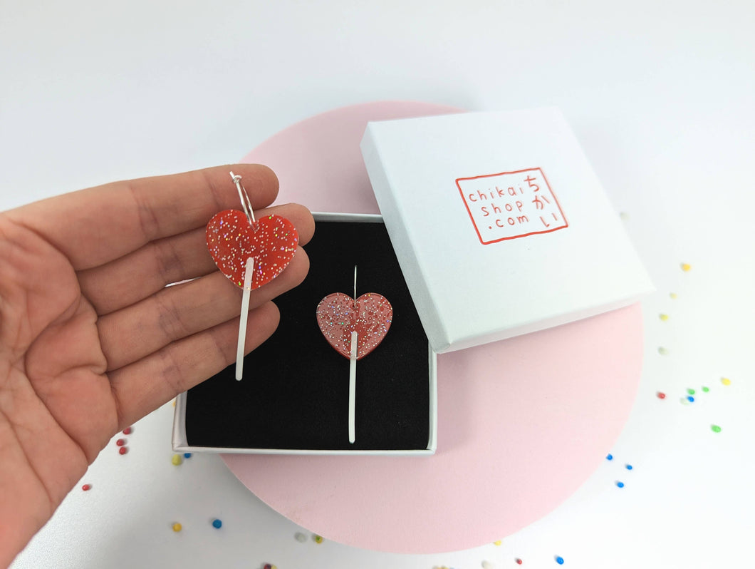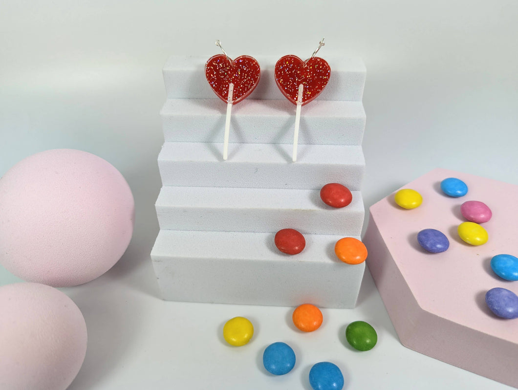This article is a quality-finished, laser cut heart lollipop earrings in glittery, red and white acrylic. The hoop is sterling silver so that your ears don't go green. The earrings includes a branded jewellery box made with FSC certified product.
